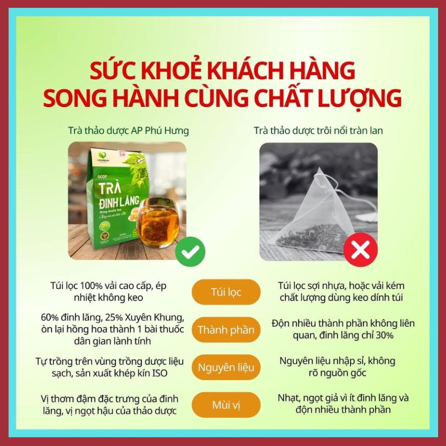 Trà Đinh Lăng của AP Phú Hưng được chiết xuất hoàn toàn từ thân và củ đinh lăng tự nhiên 🌱, trồng tại mảnh đất phù sa Thái Bình giàu dưỡng chất 🌾. Với công nghệ sản xuất khép kín hiện đại 🏭, kết hợp phương pháp lên men từ triều đại nhà Trần 👑, trà phát huy tối đa dược tính vốn có, mang đến sản phẩm chất lượng cao 🌟.