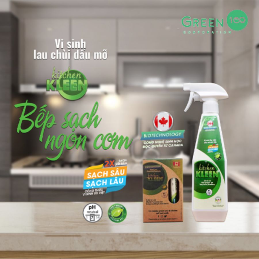 👉Công nghệ sinh học tiên tiến: Kitchen Kleen ứng dụng công nghệ sinh học từ Canada, với thành phần chứa vi sinh đặc biệt giúp chuyển hóa dầu mỡ thành nước, dễ dàng lau chùi.
