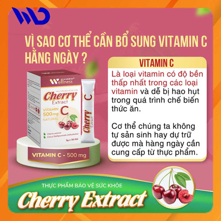 Cherry Extract 500mg Vitamin C, bột uống tăng cường hệ miễn dịch và sức đề kháng Hộp 30 gói.