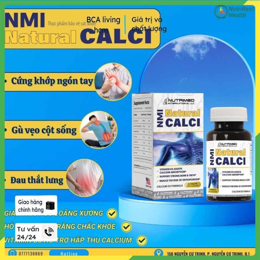 NMI Natural Calci là thực phẩm bảo vệ sức khỏe được sản xuất bởi NutriBest Health, Hoa Kỳ. Sản phẩm cung cấp canxi tự nhiên, dễ hấp thu giúp cải thiện các tình trạng thiếu canxi như đau cơ, đau nhức xương khớp bả vai, loãng xương, hỗ trợ phục hồi với những trường hợp gãy xương do chấn thương.