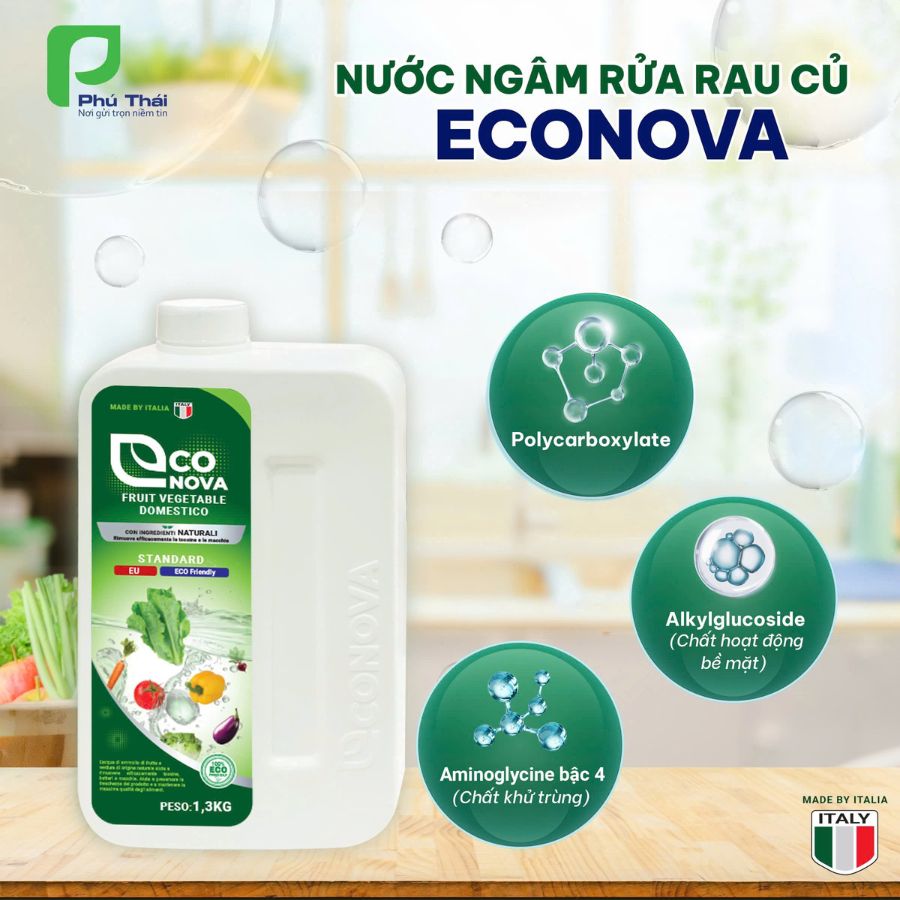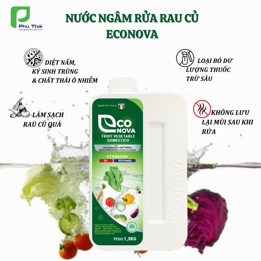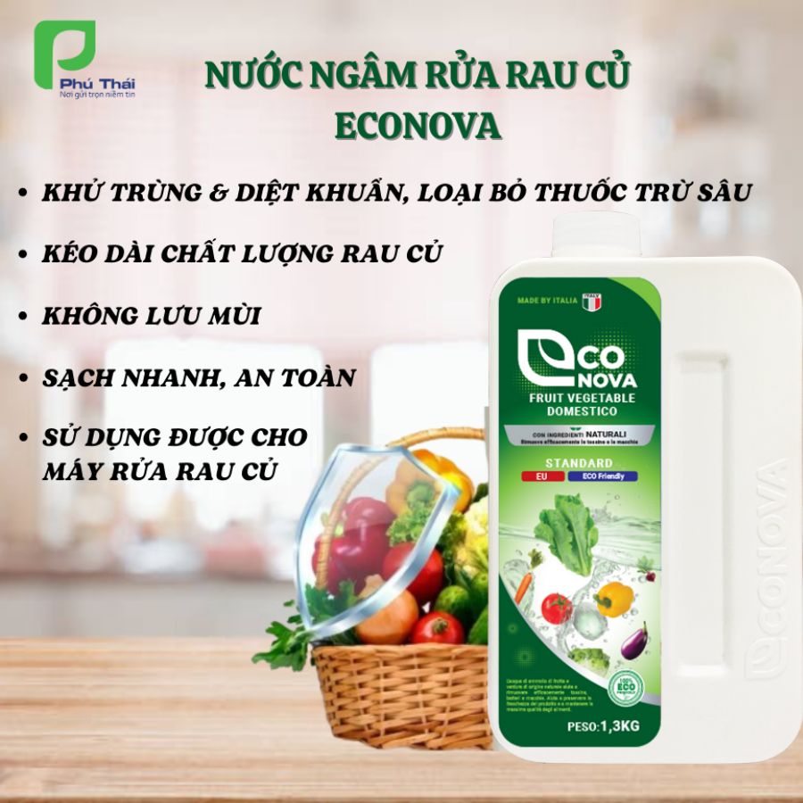 Nước ngâm củ quả Econova của Phú Thái là một lựa chọn tuyệt vời, với công thức tự nhiên, an toàn cho người sử dụng, giúp làm sạch và khử trùng rau củ quả hiệu quả mà không lo ảnh hưởng đến sức khỏe.