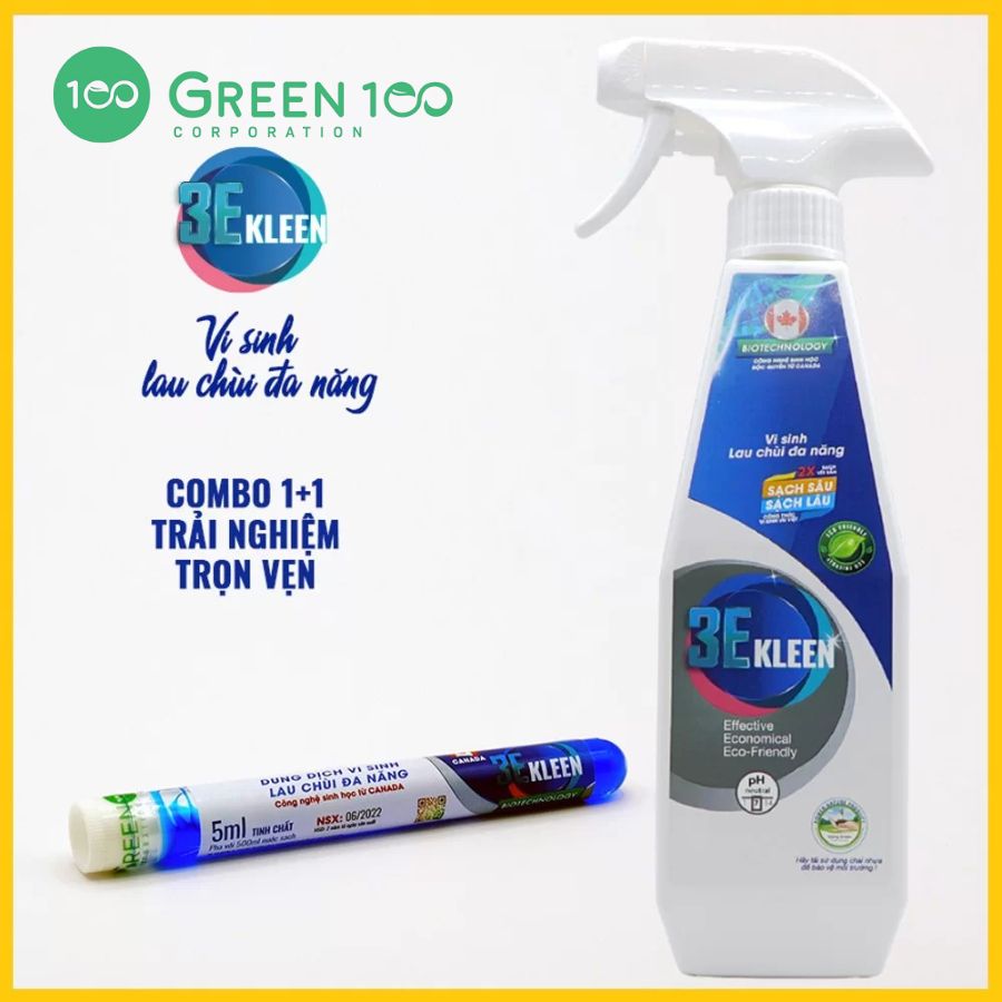 Bộ vi sinh lau chùi đa năng 3E KLEEN vi sinh lau đa năng – ứng dụng công nghệ sinh học CANADA – thành phần chứa công thức vi sinh giúp làm sạch sâu và lâu các bề mặt, ngăn mùi và vi khuẩn gây bệnh. Thành phần tự nhiên dễ phân hủy sinh học đạt tiêu chuẩn Châu Âu, an toàn sức khỏe và thân thiện môi trường. pH ~7 (trung tính) không gây kích ứng da, an toàn cho các bề mặt và thiết bị điện tử, không chứa hợp chất hữu cơ dễ bay hơi (VOCs) độc hại.
