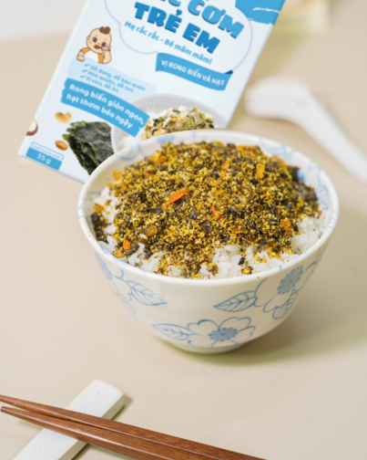Sản phẩm dùng rắc lên cơm, cháo giúp bổ sung hương vị cho món ăn, gia tăng vị giác tự nhiên của trẻ trong giai đoạn nâng cấp hành vi ăn, khám phá những mùi vị mới.