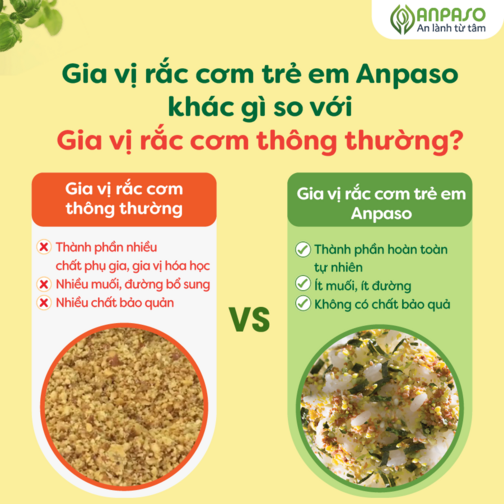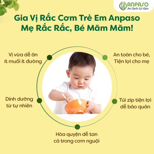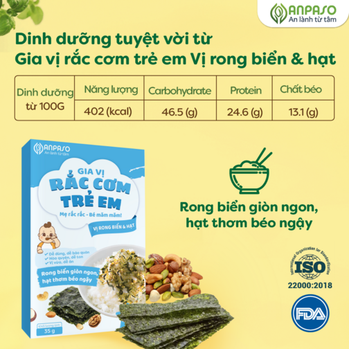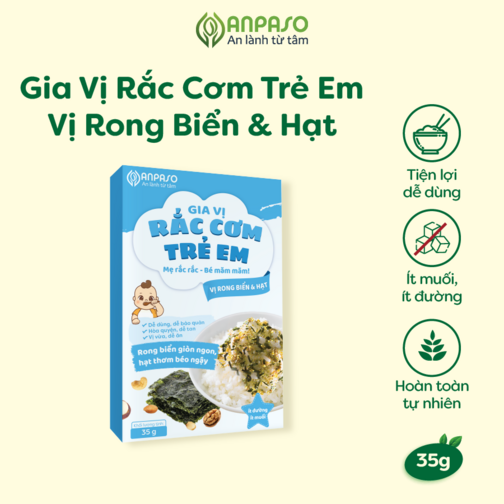 Gia vị rắc cơm Anpaso với thành phần hoàn toàn lành tính từ các loại rau củ quả, thịt cá biển tự nhiên và rong biển giàu dinh dưỡng giúp bổ sung hương vị cho món ăn, gia tăng vị giác tự nhiên của trẻ trong giai đoạn nâng cấp hành vi ăn, khám phá những mùi vị mới.