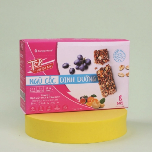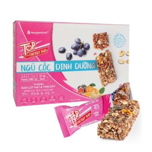2. Thành phần vị trái cây: Gạo lứt sấy (35 %), yến mạch (7 %), hạt điều (5 %), xoài sấy dẻo (5 %), mít sấy dẻo (5 %), cam lát sấy dẻo (4 %), sung mỹ sấy dẻo (4 %), hạt chia (3,5 %), nho úc sấy dẻo (3 %), glucose syrup từ bắp, muối.