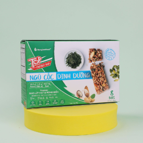 2. Thành phần vị rong biển: Gạo lứt sấy (35 %), hạt đậu phộng (10 %), hạt điều (8 %), hạnh nhân (7 %), rong biển (7 %), hạt macca (5 %), hạt bí xanh (5 %), hạt mè (1,5 %)