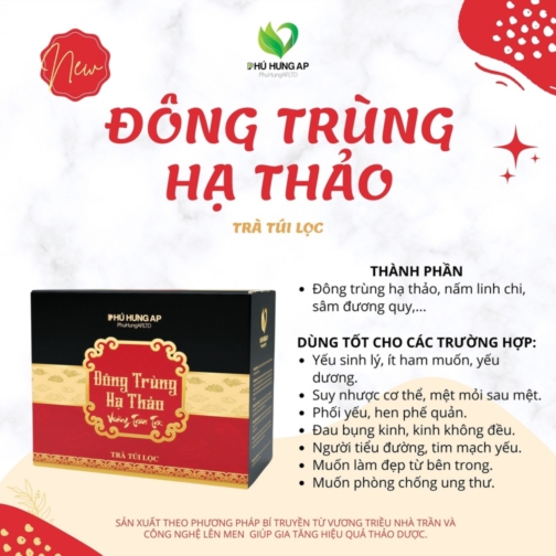 Đông trùng hạ thảo bổ thận tráng dương sinh tân giúp tăng cường sinh lý (nam và nữ) tăng hormone sinh dục nam nội sinh, tăng ham muốn.