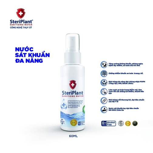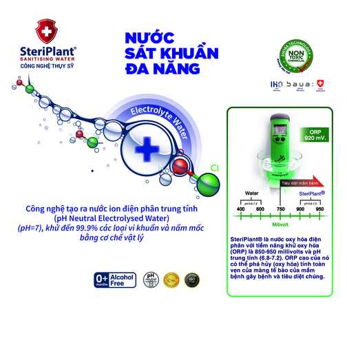 SteriPlant là dung dịch sát khuẩn điện phân trung tính (Neutral Electrolyte Water), với cải tiến vượt trội của công nghệ Thụy Sĩ, SteriPlant được công nhận là chất khử trùng an toàn trong y tế, làm sạch các thiết bị y tế không xâm nhập như khẩu trang y tế, khay đựng dụng cụ y tế.