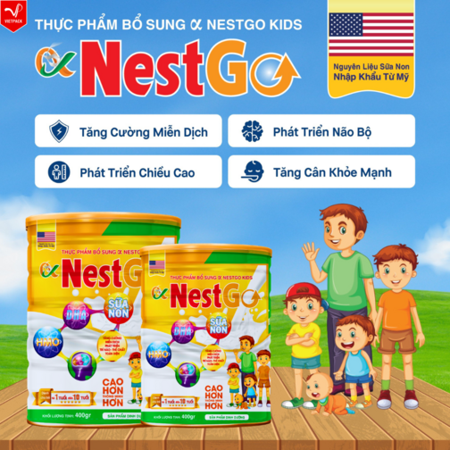 Thực phẩm bổ sung α NestGo Kids với công thức dinh dưỡng tối ưu đặc biệt bổ sung 2’FL – HMO và kháng thể tự nhiên IgG từ sữa non, giúp tăng cường miễn dịch và phát triển thể chất toàn diện.
