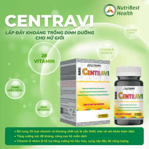 NMI CENTRAVI là một sản phẩm chăm sóc sức khỏe với chứa đa dạng các loại vitamin và khoáng chất, là hai trong số các loại dưỡng chất quan trọng của cơ thể. 11 loại Vitamin bao gồm: Vitamin A, C, D, E, K và các vitamin nhóm B như thiamin, riboflavin, niacin, acid pantothenic, biotin, B6, B12 và Folate. Vitamin có nhiều vai trò khác nhau trong cơ thể như giúp chúng ta chống lại nhiễm trùng, giữ cho dây thần kinh khỏe mạnh, lấy năng lượng từ thức ăn hoặc máu để đông máu đúng cách..vv.. đồng thời NMI CENTRAVI còn chứa 13 loại khoáng chất: calci, magie, kali, iot, florua, selen,... giúp cơ thể khỏe mạnh phát triển bình thường.