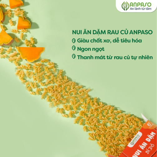 Độ tuổi trên 6 tháng, hệ tiêu hóa và bộ phận xử lý thức ăn dần hoàn thiện và phát triển. Trong giai đoạn này các mẹ nên kết hợp bổ sung các sản phẩm ăn dặm để giúp bé tập nhai, kích thích răng miệng phát triển, tập làm quen các nguồn dinh dưỡng khác bên cạnh sữa mẹ. Nui ăn dặm Anpaso, ngoài việc bổ sung dinh dưỡng, tốt cho tiêu hóa của bé thì với kết cấu nui xoắn, màu sắc bắt mắt giúp bé dễ dàng cầm nắm, hào hứng với các bữa ăn. Nui mềm dai, ngon ngọt tự nhiên góp phần tạo khẩu vị cho bé ăn thêm ngon, tập nhai và học ăn tăng thô.