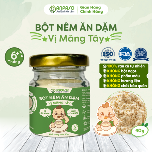Độ tuổi bé bắt đầu ăn dặm (trên 6 tháng) răng miệng và hệ tiêu hoá của con chưa thể xử lý được ngay các sản phẩm gia vị thông thường cho người lớn. Do đó một sản phẩm bột nêm có nguồn gốc rau củ tự nhiên, lành tính sẽ là ưu tiên hàng đầu của các mẹ. Hạt nêm cho bé ăn dặm Anpaso với 100% thành phần rau củ, vị đậm đà được điều chế từ chính thành phần rau củ tự nhiên giúp nuôi dưỡng và kích thích vị giác trẻ, giúp trẻ tập làm quen với những hương vị mới ngoài sữa mẹ.