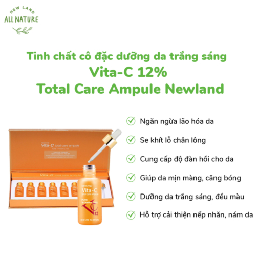 Tinh chất cô đặc dưỡng da trắng sáng Vita-C Total Care Ampule Newland có chứa hàm lượng 12 % vitamin C nguyên chất; thành phần “vitamin peptide” và chứa chiết xuất từ tế bào gốc thực vật có tác dụng kích hoạt các tế bào da giúp tế bào da luôn khỏe mạnh; ức chế sắc tố trên da hỗ trợ làm mờ các đốm nâu hoặc cải thiện vùng da ửng đỏ, giúp ngăn ngừa lão hóa, dưỡng sáng, làm đều màu da và cải thiện nếp nhăn.