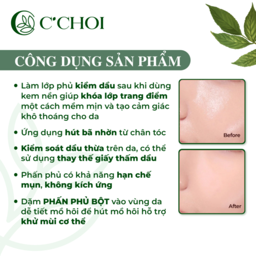 C’Choi Mineral Velvet Film Powder – là phấn phủ dạng bột, không màu của thương hiệu Mỹ phẩm xanh C’Choi. Mineral Velvet Film Powder có nguồn gốc từ khoáng chất kích thước siêu mịn, có khả năng kiềm dầu hiệu quả, giữ bề mặt lớp trang điểm khô thoáng và tạo hiệu ứng nhung mịn, trong suốt tự nhiên. Ngoài ra, thành phần chiết xuất trầu không giúp kháng viêm, ngăn ngừa và giảm mụn.