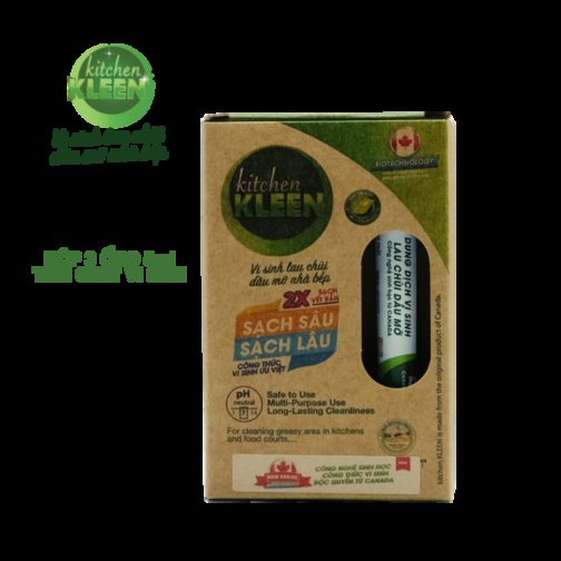 (11.) Mô tả ngắn kitchen KLEEN ứng dụng công nghệ sinh học từ Canada, với thành phần chứa vi sinh đặc biệt chuyển hóa vết dầu mỡ trong nhà bếp thành nước giúp dễ lau chùi, hạn chế mùi hôi và vi khuẩn gây bệnh. Sản phẩm chứa thành phần tự nhiên dễ phân hủy sinh học và đạt tiêu chuẩn Châu Âu, an toàn sức khỏe và thân thiện môi trường, an tâm sử dụng hàng ngày. pH = 7 không gây kích ứng da, không gây ăn mòn thiết bị, không chứa hợp chất hữu cơ dễ bay hơi (VOCs).